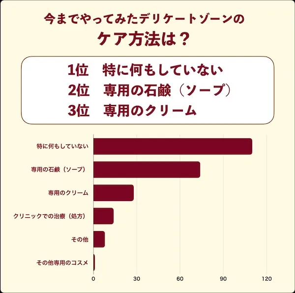 | 今までやってみたデリケートゾーンのケア方法 1位 特に何もしていない …………… 46.8% 2位 専用のソープを使った ………… 31.5% 3位 専用のクリームを使った … 11.9% |